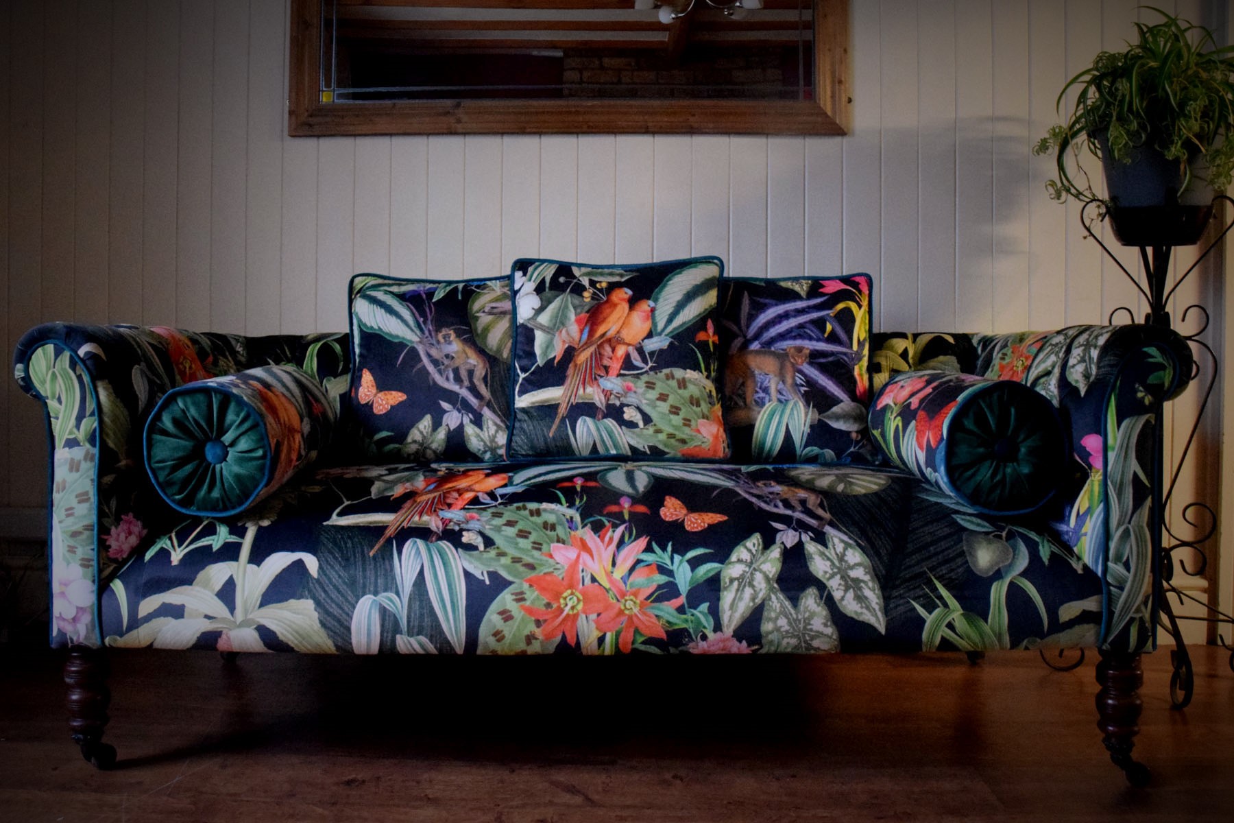 client had selected a modern velvet with a bold vibrant pattern. Whilst I had rebuilt the structure of the settee using